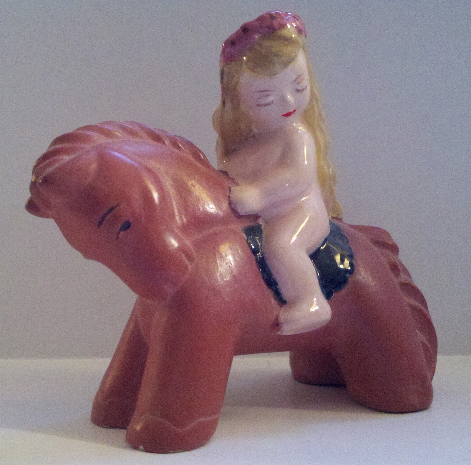 Here's a sweet little pottery figurine of Lady Godiva. The signature ''HELEN'', above, didn't tell me much, but luckily I did find a very similar figurine of a blonde nudie-cutie-patootie on a grey horse, below, which is incised with 'Lady Godiva Hermione'.